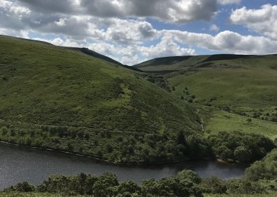 Anyway, my walk continued around the head of and then down a small valley; I missed the best path and ended up descending very steep grass – more reminiscent of the Lake District than Dartmoor – to cross the river at a waterworks bridge and pick up the path back along the bank of the reservoir. This too reminded me of the Lakes – steep hillsides; water on the left with a perfect ‘Swallows and Amazons’ islet and a shaley path undulating back to the dam, and the car park.
