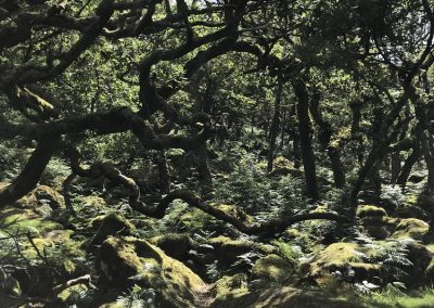 I head on into Black a Tor Copse; this is now a nature reserve and is one of only three remaining high-altitude, ancient woodlands on Dartmoor – presumably once considerably more extensive. It’s a beautiful place – ancient oaks draped with moss, old man’s beard and other lichens, growing out of the clitter on the bank of the river. Today, the bright sun is filtered through the leaves and trunks, so the air almost seems to turn green; the track winds through and over the boulders, always in earshot of the river and it feels very special.