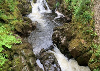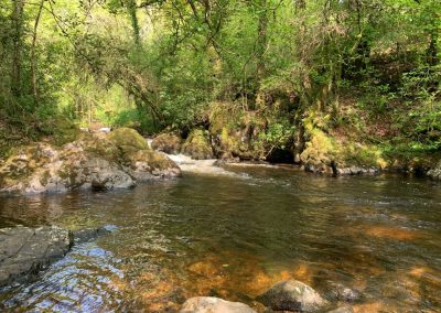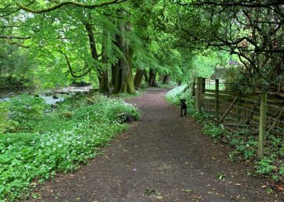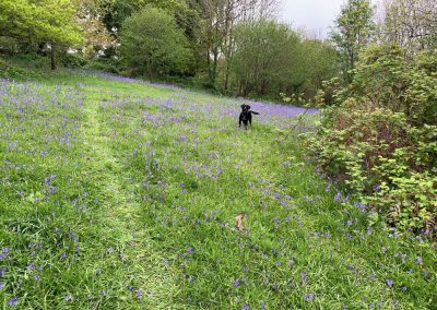 Today though, we head down and left, to take in the best of the flowers and the river. The smell is remarkable; the tang of wild garlic which is flowering everywhere here, mixed with the sweet smell of bluebells. And there are a lot of bluebells – great drifts of them filling the meadows we’re walking through as we head, first gently then steeply down to the river again. It’s calmer here and there’s a series of idyllic, deep, brown, still pools punctuated and fed by rapids and small waterfalls. For a dog who likes swimming as much as Marloe does, it doesn’t get much better than this and she’s in straightaway. Its great to watch the huge pleasure she obviously gets from this, her tail wagging furiously under water before scrambling out and, inevitably, soaking me as she shakes herself dry.