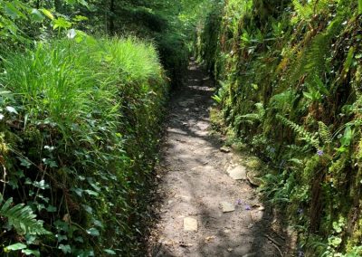 Instead of turning left then, head straight on, through a tiny yard and on up another lovely track for five minutes. Immediately after the first gate, a thin earthy path leads into the ancient woods on the left. There’s a laminated notice on a tree; it’s written by the new owners of the wood, Richard and Beth, explaining that they are working the woods to restore ground cover and under storey with the intention of encouraging the song bird and small mammal populations. It also says that we are very welcome to walk in the woods which is great news – if only this were more common.